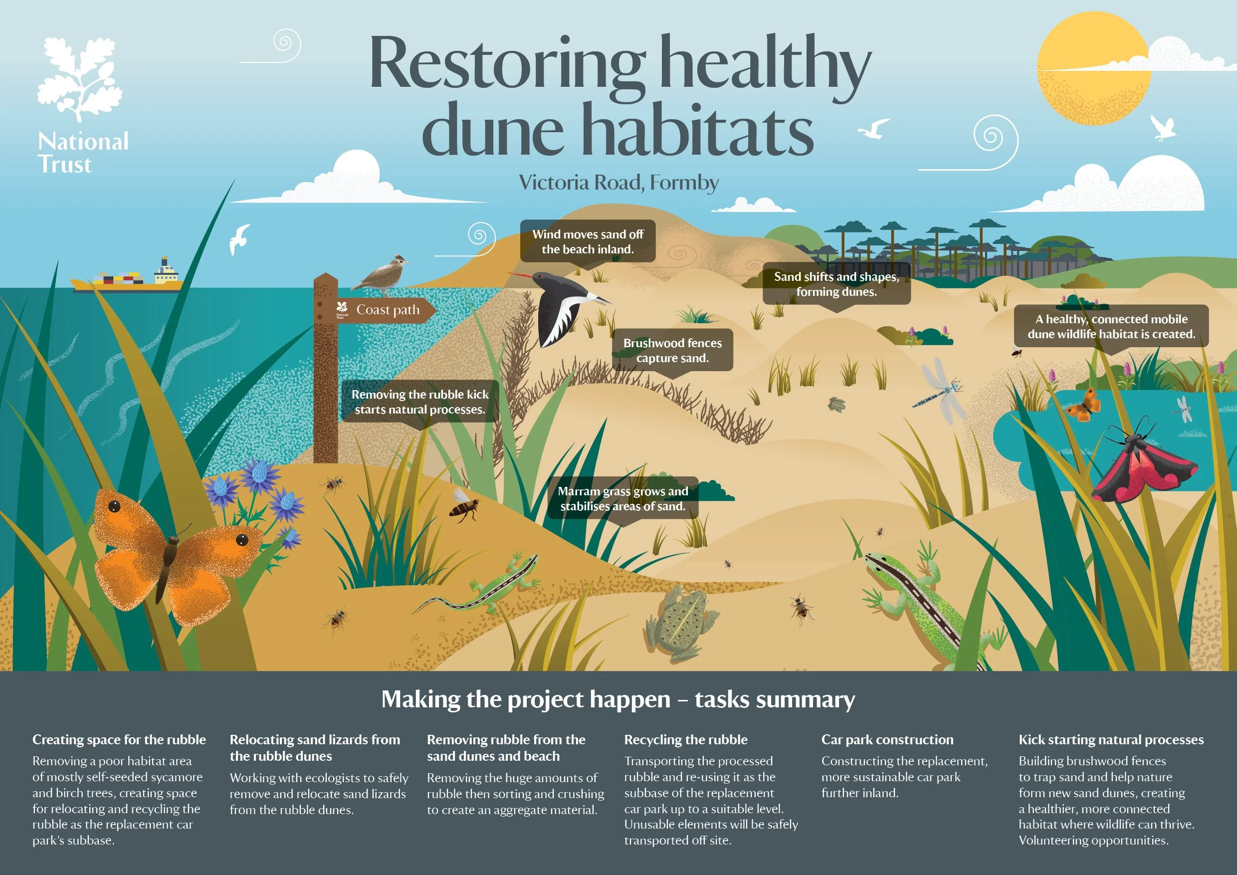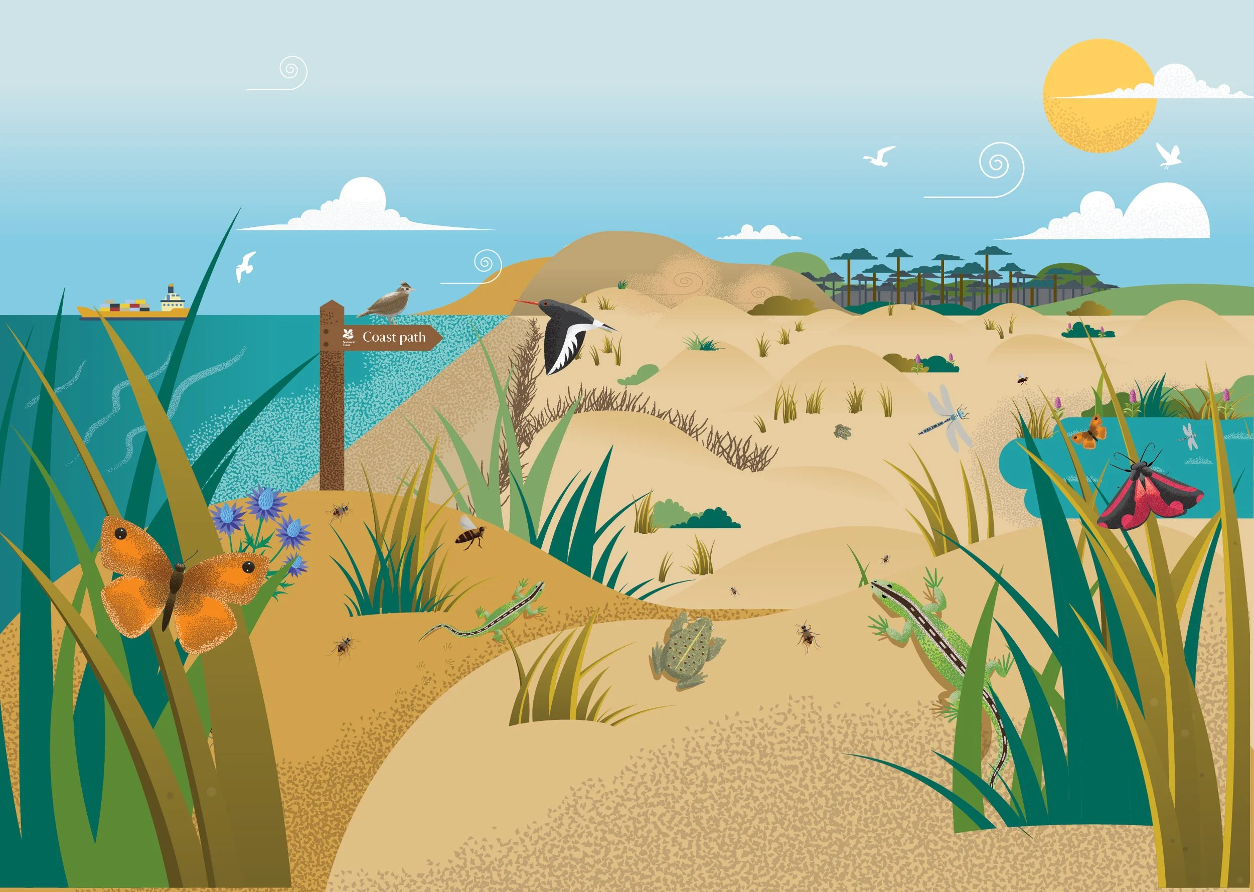 In 2025, National Trust Formby are carrying out a major conservation project at Victoria Road to remove and recycle the rubble and restore rare sand dune habitats. This conservation work will provide long-lasting benefits for people and wildlife. Restoring the frontal sand dunes will re-invigorate the natural processes needed to protect and bring new wildlife to a huge area of rare dune habitat. I was asked to bring their vision to life in this fully illustrated scene by showing the wildlife thriving and the natural landscape reshaping for better.